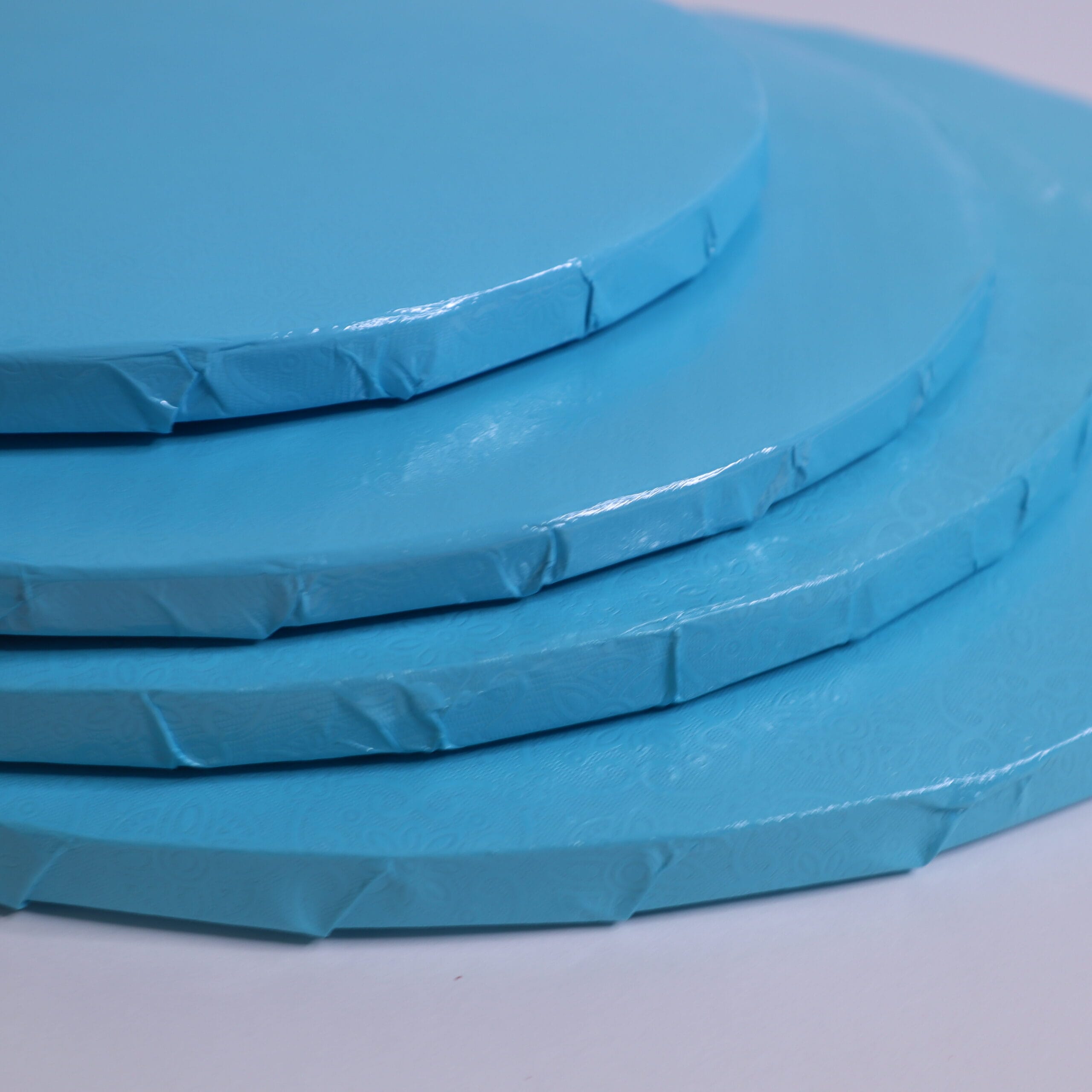 Gruba niebieska tekturowa podkładka do ciasta lub tortu o średnicy 34 cm i grubości 1,2 cm.