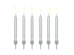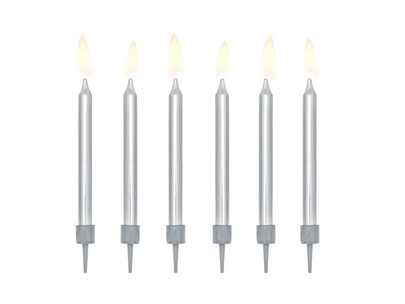 Małe srebrne świeczki na tort. Te piękne złote świece z Party Decor są idealne do ozdabiania tortów urodzinowych! Rozmiar: ok. 6 cm wysokości. Zawartość: 6 świec i 6 świeczników.