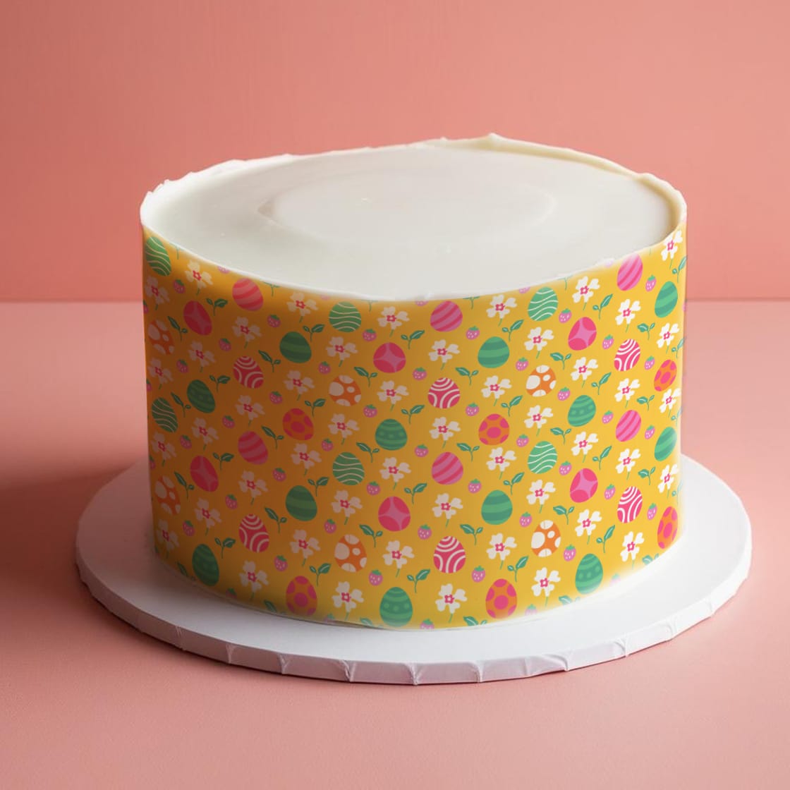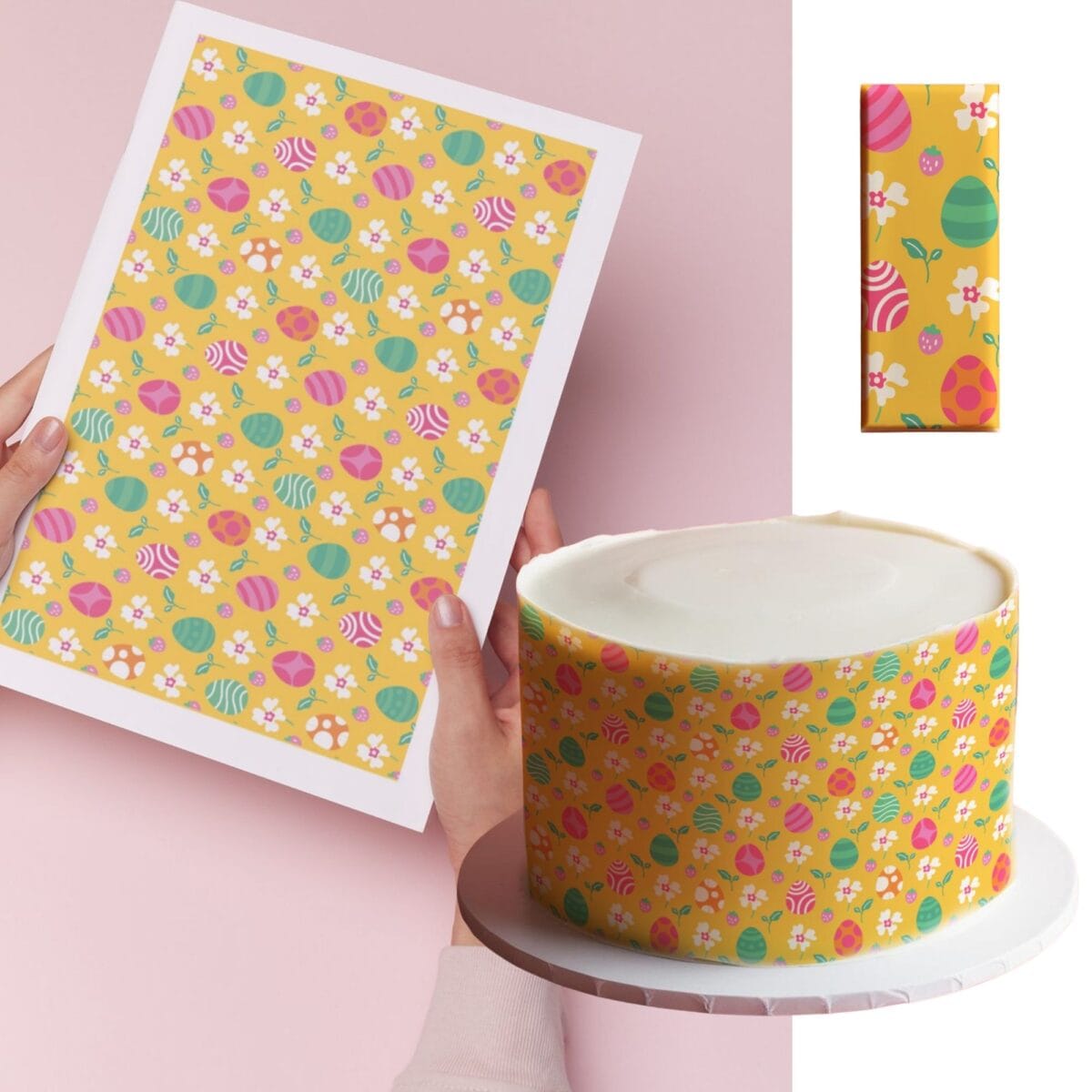Radosna, wielkanocna tapeta cukiernicza z motywem kolorowych pisanek na intensywnym żółtym tle to idealna propozycja na świąteczne wypieki. Ciepła, słoneczna kolorystyka przyciąga wzrok i wprowadza pozytywny, wiosenny nastrój. Ten wzór doskonale sprawdzi się do dekoracji tortów, babeczek, ciastek czy mazurków przygotowanych na Wielkanoc – zarówno dla dzieci, jak i dorosłych.