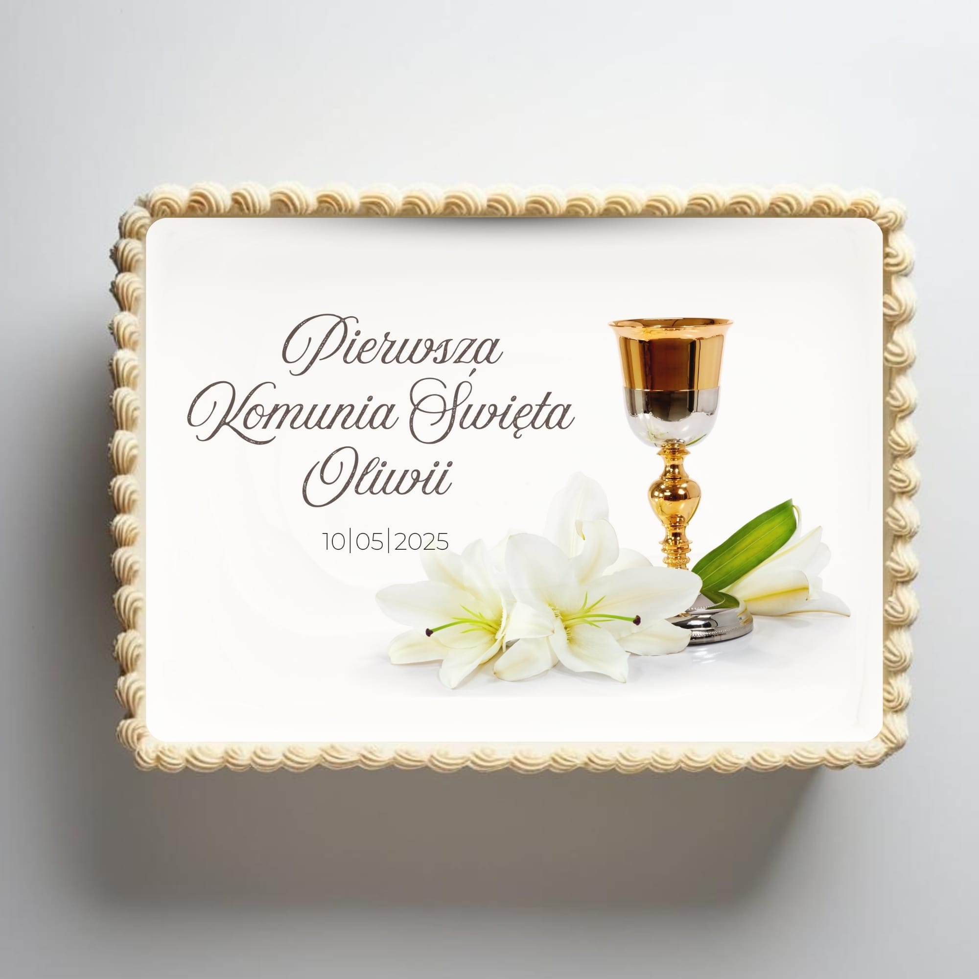 Minimalistyczny i elegancki wydruk cukrowy z motywem kielicha oraz białych lilii. Uniwersalny – pasuje na tort dla dziewczynki i chłopca.