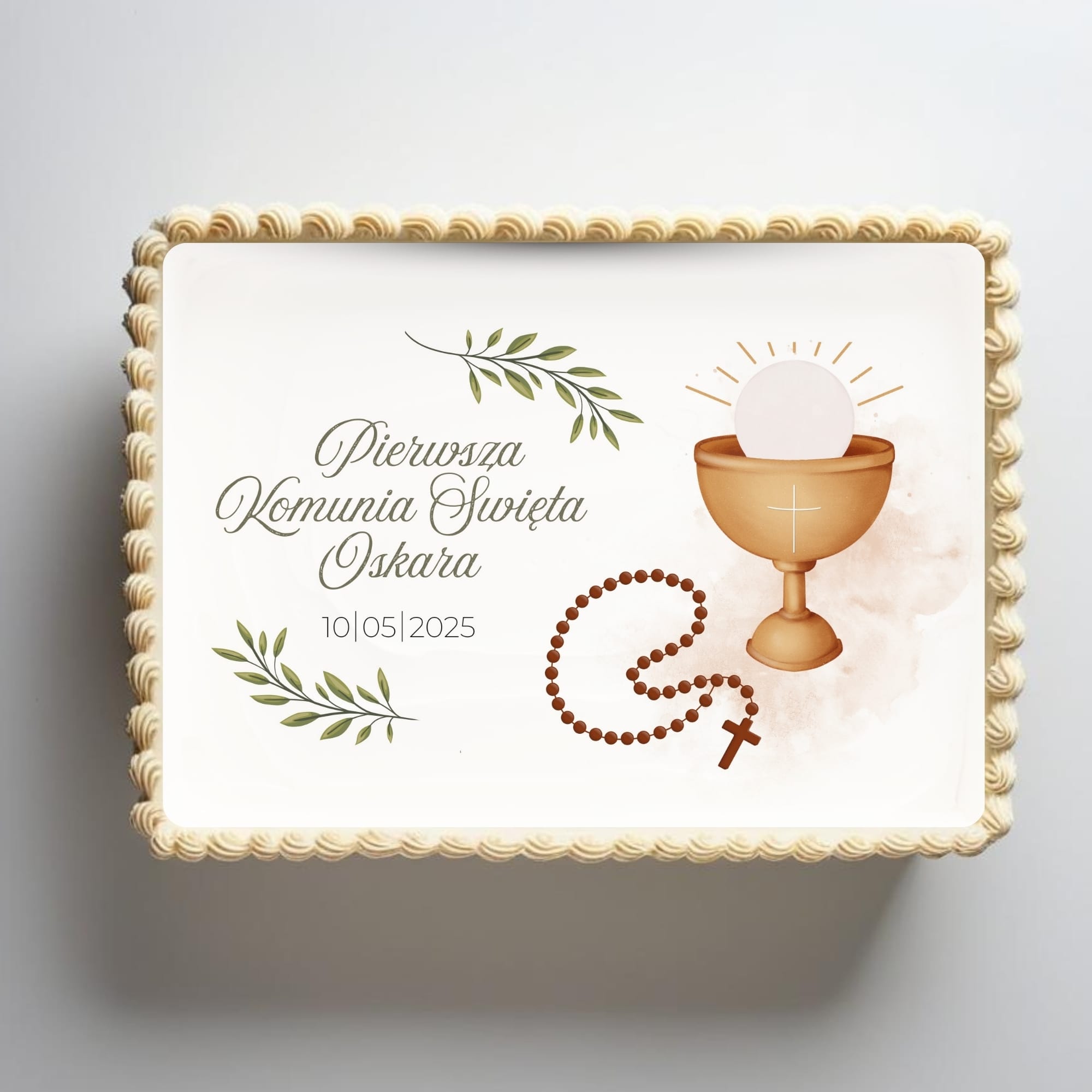 Klasyczny wydruk cukrowy na tort komunijny z grafiką kielicha i hostii. Uniwersalny motyw, idealny na tort komunijny dla chłopca lub dziewczynki.